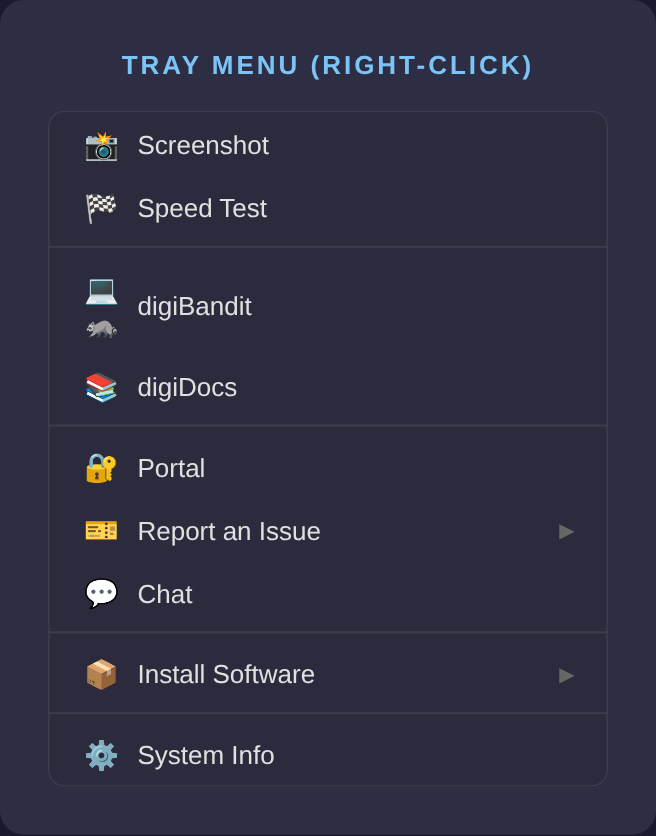 The digiBandit tray app lives in your system tray (the small icons near your clock) and gives you quick access to support, ticket submission, speed tests, software installation, and documentation without opening a browser.